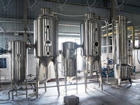 將料液加熱上升,從噴管噴入蒸發(fā)室,進(jìn)行汽液分離,其料液從循環(huán)管回到加熱室下部再加熱,料液受熱又噴入蒸發(fā)室開成循環(huán)。單效濃縮器料液濃縮到規(guī)定的程度,經(jīng)取樣確定合格后由出料口出料,蒸發(fā)室蒸發(fā)出來的蒸汽經(jīng)除沫器消除泡沫再經(jīng)汽液分離器,部份料液返回蒸發(fā)室,其余二次蒸汽由冷凝器與冷卻器冷卻成液體進(jìn)入貯液桶,讓不凝氣體排入大氣或真空泵帶走。